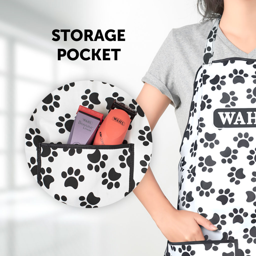 Paw Print Apron is made from durable, splash proof micro fibre that protects from natural hazards of bathing and grooming. Designed with storage pocket, adjustable neck and waist straps.