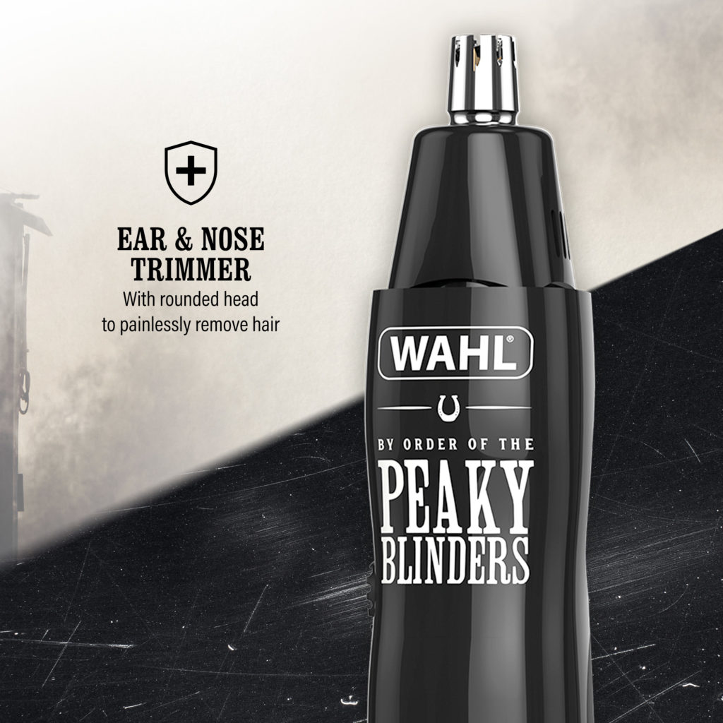 The Wahl and Peaky Blinders collaborative Corded Clipper & Personal Trimmer Gift Set is equipped with a battery powered nasal trimmer, corded clipper, cape, and storage bag.