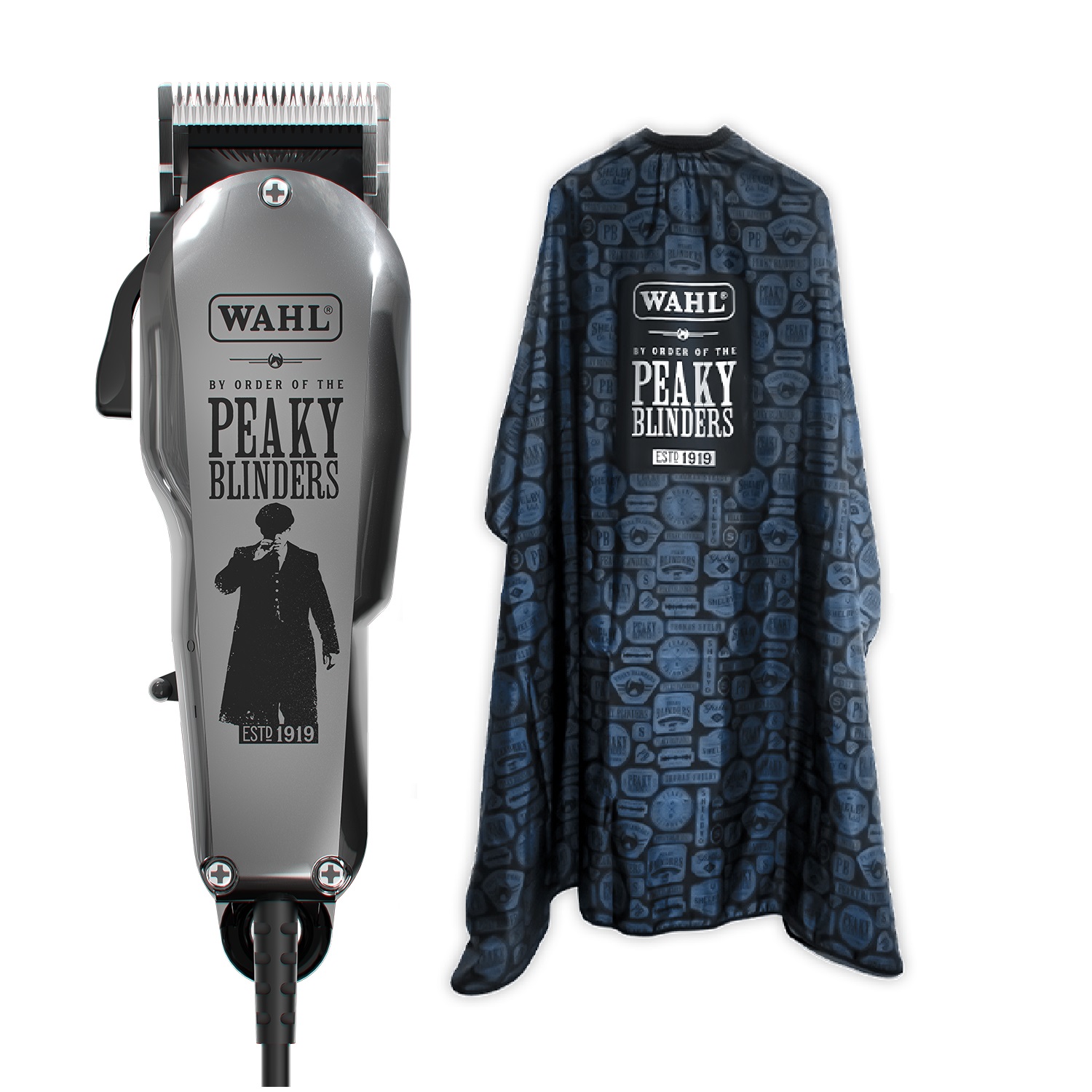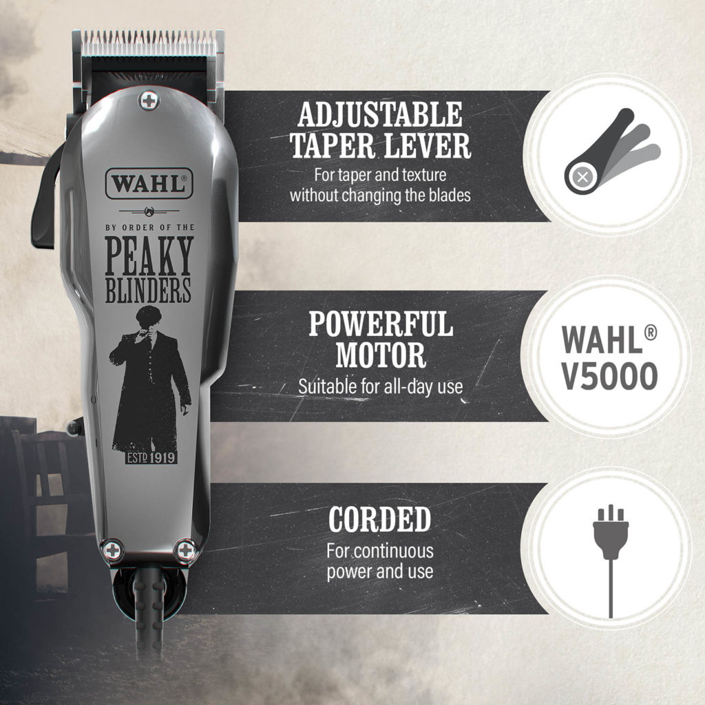 Be the talk of the town with the Special Edition WAHL and Peaky Blinders collaborative Clipper Kit for barbers and hairdressers, featuring a special-edition corded clipper and complimentary cape