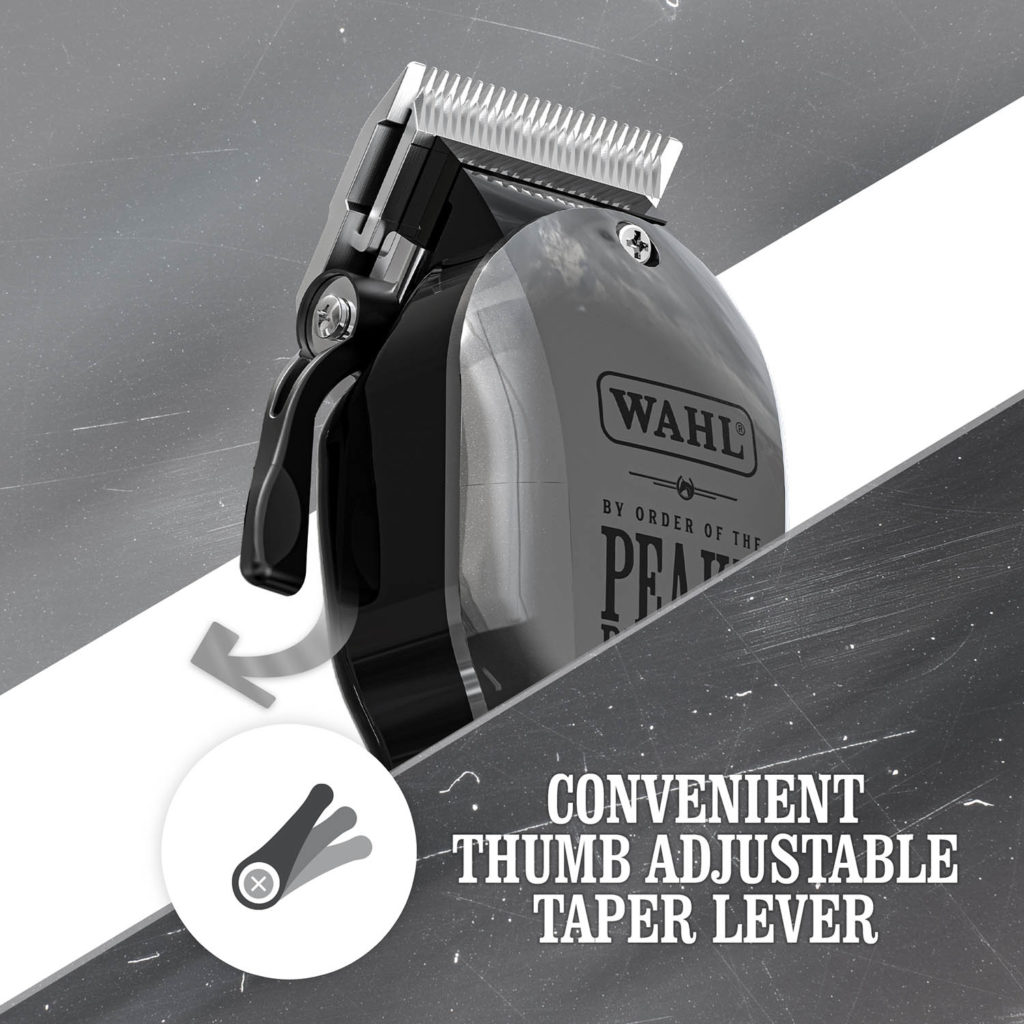 READY FOR TAKING CARE OF BUSINESS As Tommy Shelby said, “Get yourself a decent haircut, man. We’re going to the races!” As a must-have tool of the trade, the WAHL & Peaky Blinders clipper features a precision fade blade for super close cutting and fading, and a powerful motor designed for all day use. The Taper Blade also supports the ‘scooping’ action of your c-stroke. It has a conveniently located thumb lever that lets you adjust the taper without having to change the blades or adding additional combs.